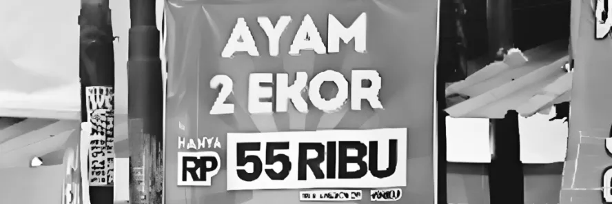 Maka tadi ketika melihat ada spanduk warung yang menawarkan dua ekor ayam goreng Rp55.000 saya bersyukur. Tetapi karena mulai terasa kepyur gerimis saya tak melongok seberapa besar ayamnya. Duit segitu, Rp55.000, tak cukup untuk membeli dua ekor belibis goreng. Apalagi ayam panggang baru, di area tetangga, masih sekelurahan, yang dengan diskon promo pun seekor ayam Rp59.000.