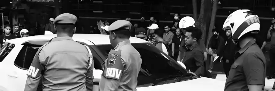 Sebuah kendaraan yang dihentikan polisi karena diduga merekam penangkapan kelompok remaja di depan kantor Polda Jateng, Kota Semarang, Sabtu (30/8/2025). Penghapusan paksa konten digital ini dilakukan bagi setiap warga yang ketahuan merekam aktivitas penangkapan kelompok remaja di Jalan Pahlawan.
