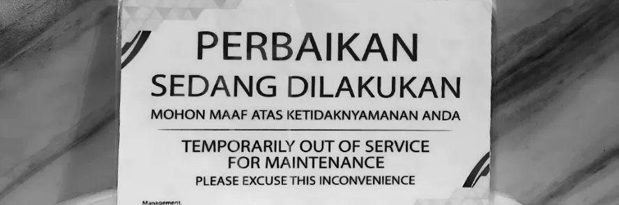 Dari sisi desain grafis, maklumat ini bagus. Pilihan fon legibel, mudah kita baca. Dari sisi tata huruf menerapkan prinsip headline atau tajuk pesan: “perbaikan sedang dilakukan”, kemudian disusul teks lebih kecil. Memang sih berupa kalimat pasif, namun akan lebih jelas siapa yang bertanggung jawab jika menggunakan kalimat aktif karena ada subjeknya: “kami sedang memperbaiki”.