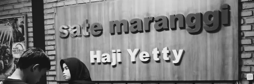 Sampai sekarang saya tak tak paham kenapa sate maranggi, yang berpusat di Purwakarta, Jabar, menggunakan jenama Haji Yetty, bukan Hj. Yetty maupun Hajjah Yetty. Kalau mengikuti ejaan dalam KBBI adalah Hajah Yetty. Anda yang lebih paham bahasa Arab mungkin dapat menjelaskan. Di cabang Cibubur, bukan di Jaktim namun masuk wilayah Depok, saya tak menanya kasir karena sungkan.
