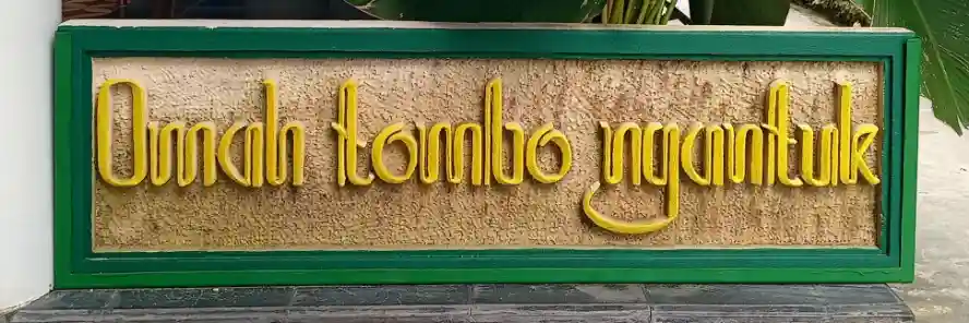 Dari arah agak menyamping, tulisan beraksara Latin dengan langgam hanacaraka ini sulit dibaca, apalagi teksnya kurang kontras dengan latarnya. Tertulis di situ: Omah tombo ngantuk. Omah itu rumah. Adapun tamba, dilafalkan tombo kalau tanpa akhiran, adalah obat.