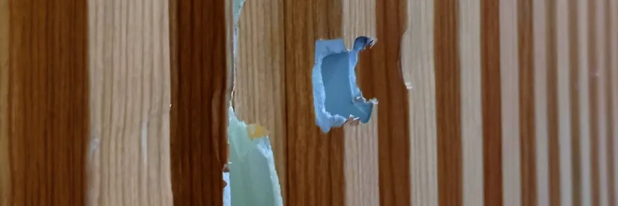 Panel dinding mirip kayu di warung Sunda dengan lalap berlimpah di Jatiasih, Kobek, Jabar, ini jebol. Saya tak tahu penyebabnya selain menduga akibat benturan dengan sudut keras.